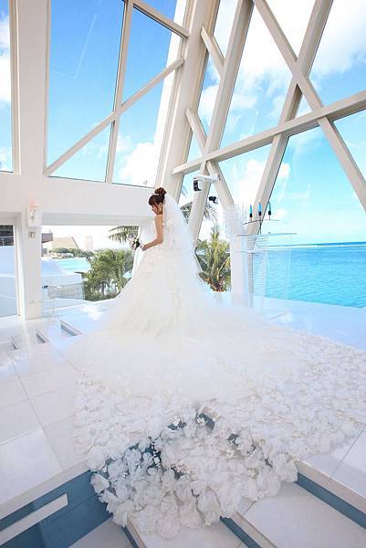 (穿著美麗的白紗搭配藍天白雲和清澈的大海,真的太夢幻了!!)