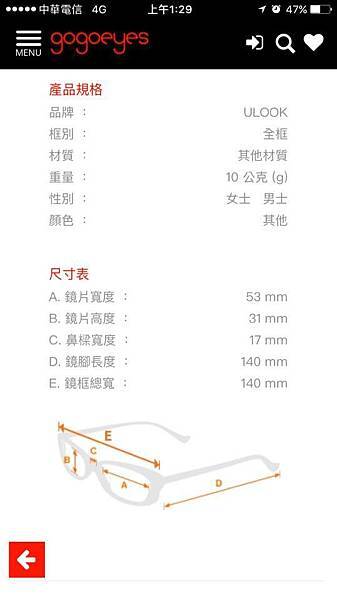 底下還有商品規格,可輕鬆了解眼鏡的尺寸和材質,